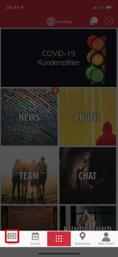 In Ihrer App befindet sich am unteren Bildschirmrand unser “Footermenü”. Hier haben Sie die Möglichkeit 4 prominente Bereiche Ihrer App zu präsentieren. Der 5. Punkt (Bild mittig) zeigt auf das Hauptmenü.